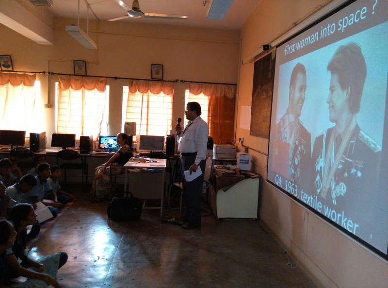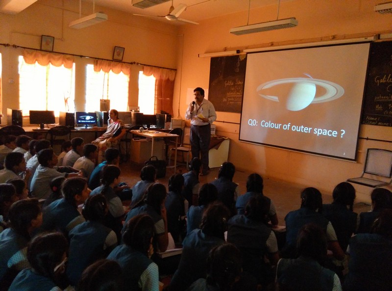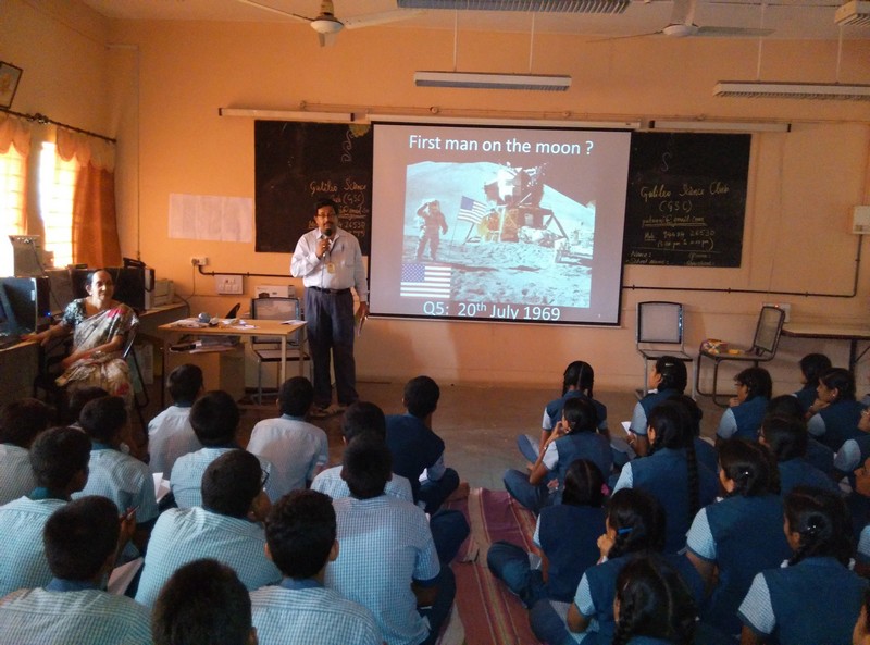 A science talk was organized for the students of X and IX standards on Monday 22 June 2015. An Electrical Engineer from ISRO, Sri Nagaraj Ananth gave a talk on Rockets and Satellites. Mr. Ananth, talked about the first international and Indian astronauts and cosmonauts who travelled to space and moon. He also talked about various stages of rocket launching. Mr Ananath is likey to start a science club namely Galileo Science Club and he gave an introduction about it. The talk was very impressive, interesting and motivational. He showed many videos realted to his talk.